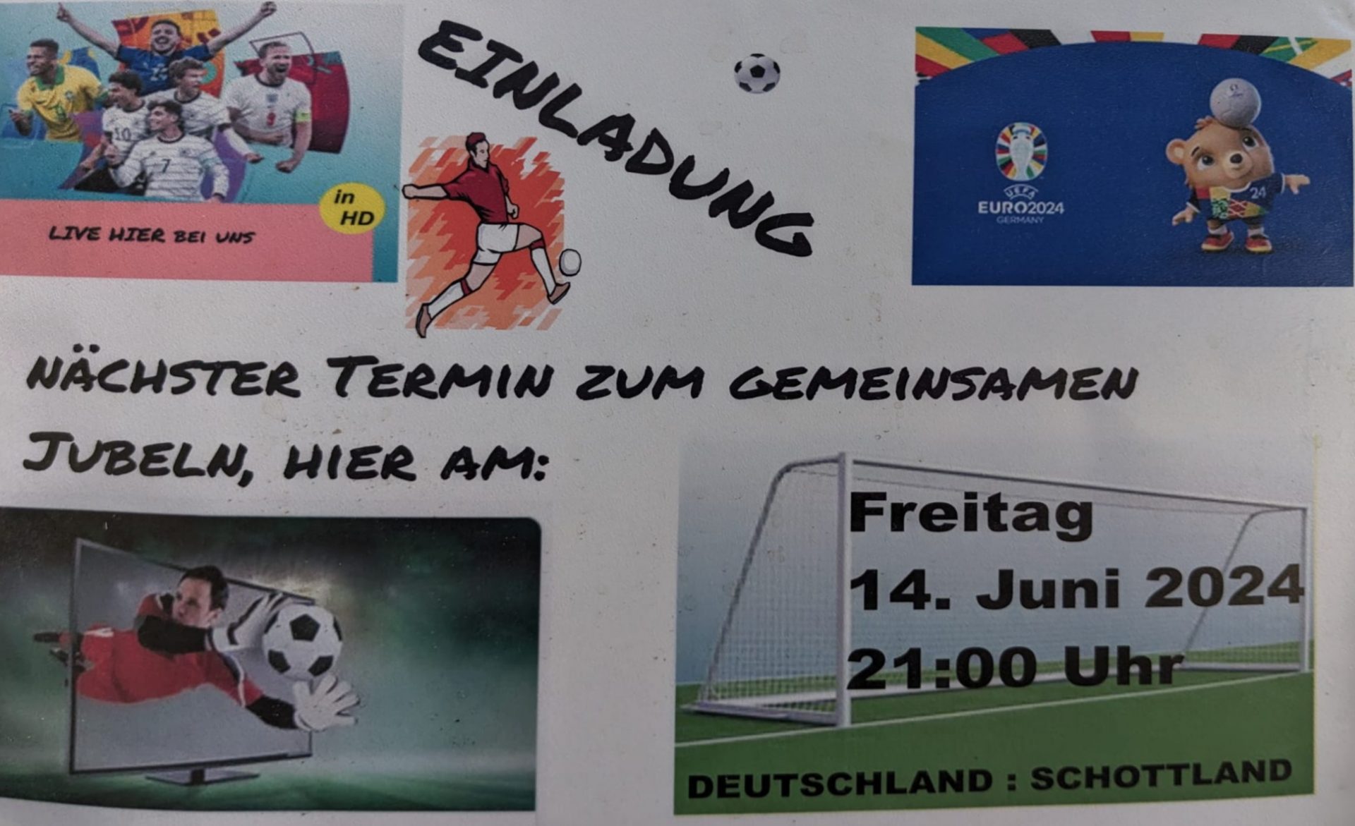 Einladung zum Public Viewing auf Leinwand mit Beamer. Bitte Stühle ohne hohe Rückenlehne (keine Hochlehnerstühle) mitbringen. PS. Aus Erfahrung lässt sich das Spiel um 18 Uhr aufgrund der Helligkeit nicht so gut sehen.